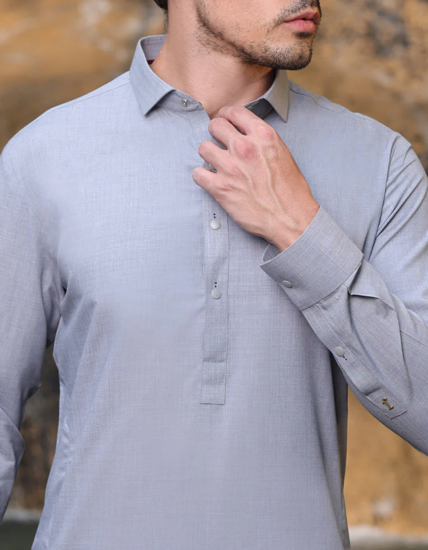 This basic men's Grey Blended Casual Kameez Shalwar epitomizes effortless sophistication and classic charm, making it a wardrobe staple for various cultural and casual events.